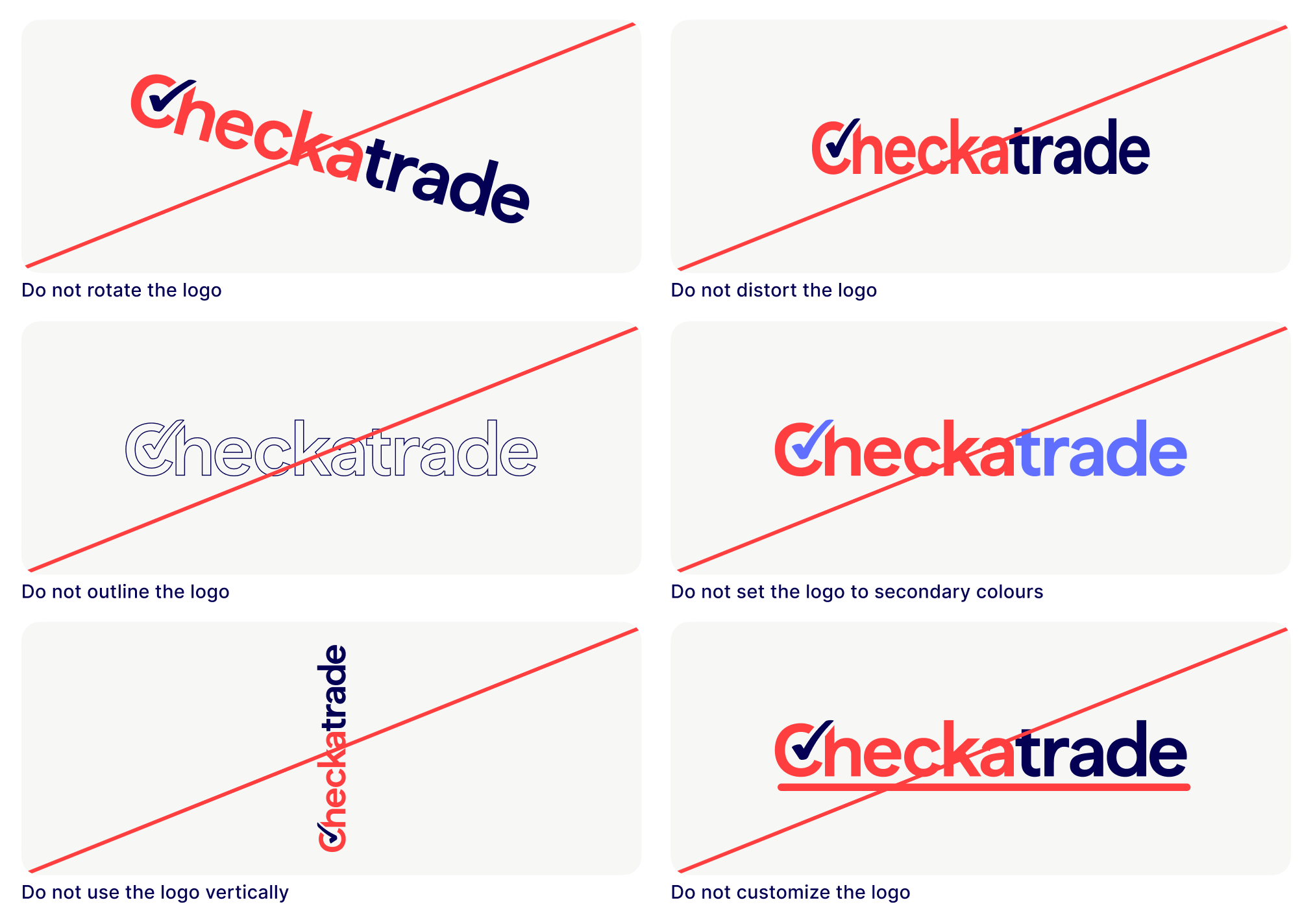 Our logo helps us to stand out and be recognised. It is a visual summary of what makes Checkatrade special. The check mark at the start of the logo is our promise that all tradespeople are checked and reviewed and is a mark of the quality that we stand for.